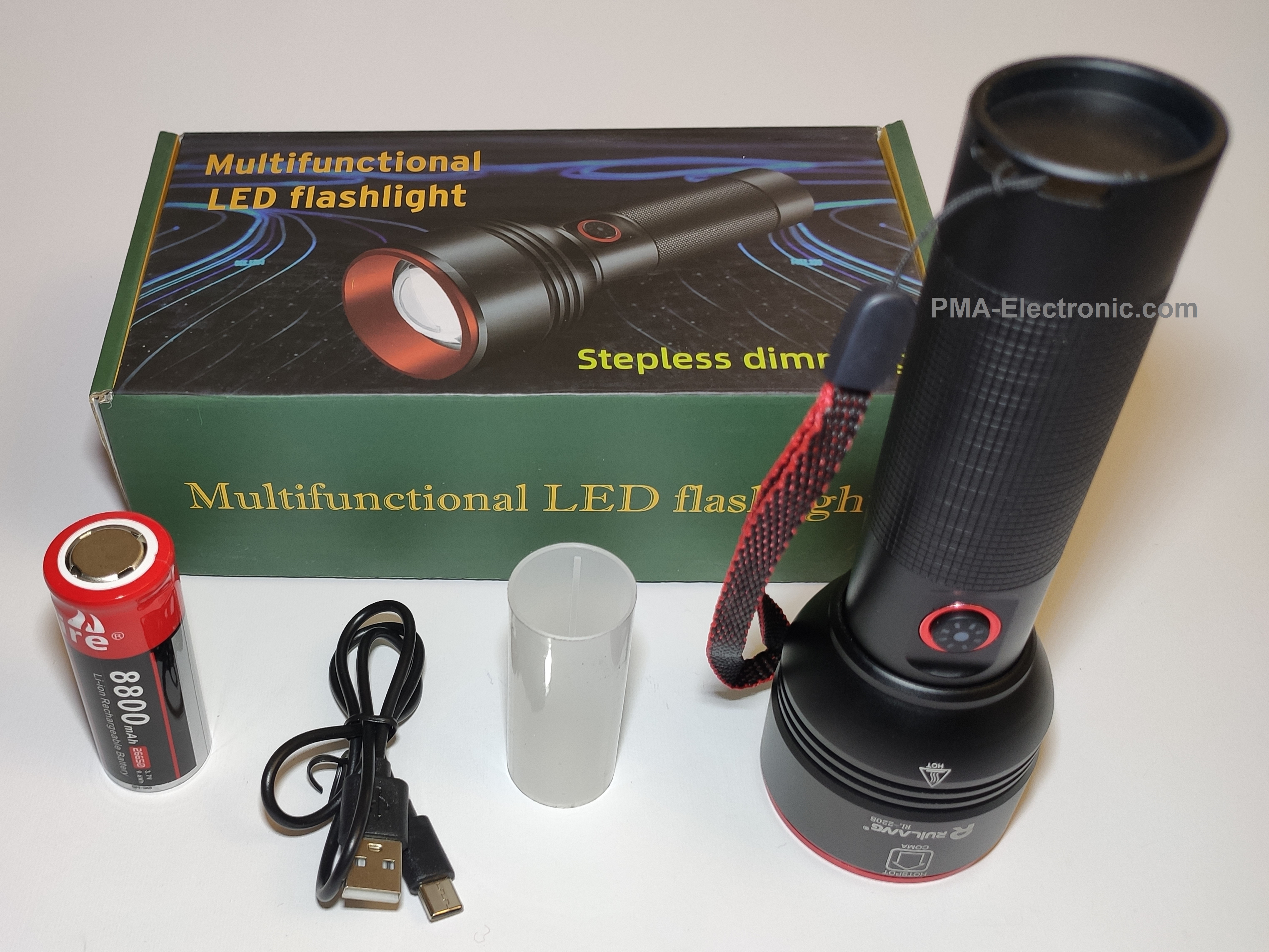 - محتویات داخل بسته: چراغ قوه RUILANG RL-2208، کابل شارژ USB-C، 1 عدد باتری 26650 با ظرفیت 8800 میلیآمپر، کیف
