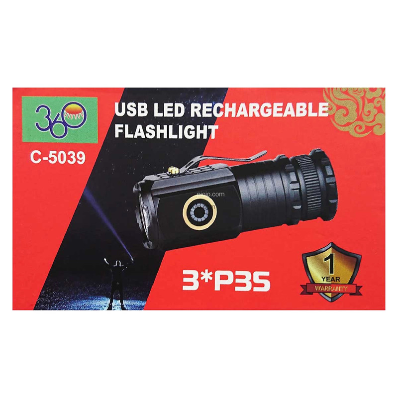 چراغ قوه 360 مدل C-5039 با داشتن لامپهای 10 واتی، مجموعاً 30 وات روشنایی تولید میکند، که میتواند در شرایط تاریک، نور کافی را برای شما فراهم کند.