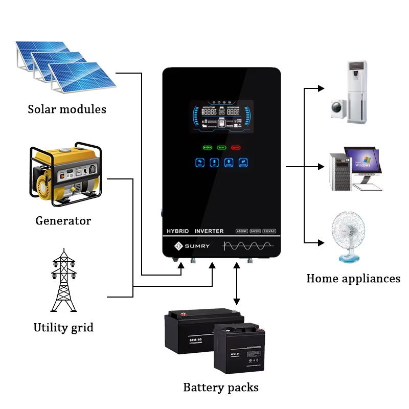 اینورتر خورشیدی HGX6.5KW (SUMRY) یک راهکار ترکیبی و همهکاره برای تبدیل انرژی خورشیدی به برق قابلاستفاده است. این دستگاه بهعنوان یک «سانورتر» (Hybrid inverter / Sunverter) و «اینورتر شارژر» طراحی شده تا همزمان وظایف اینورتر، شارژر باتری و مدیریت منابع انرژی (شبکه، باتری، PV) را با بالاترین بازده انجام دهد. طراحی مدرن با پوشش شیشهای و نمایشگر لمسی 6.25 اینچی تجربه کاربری ساده و حرفهای را فراهم میکند.